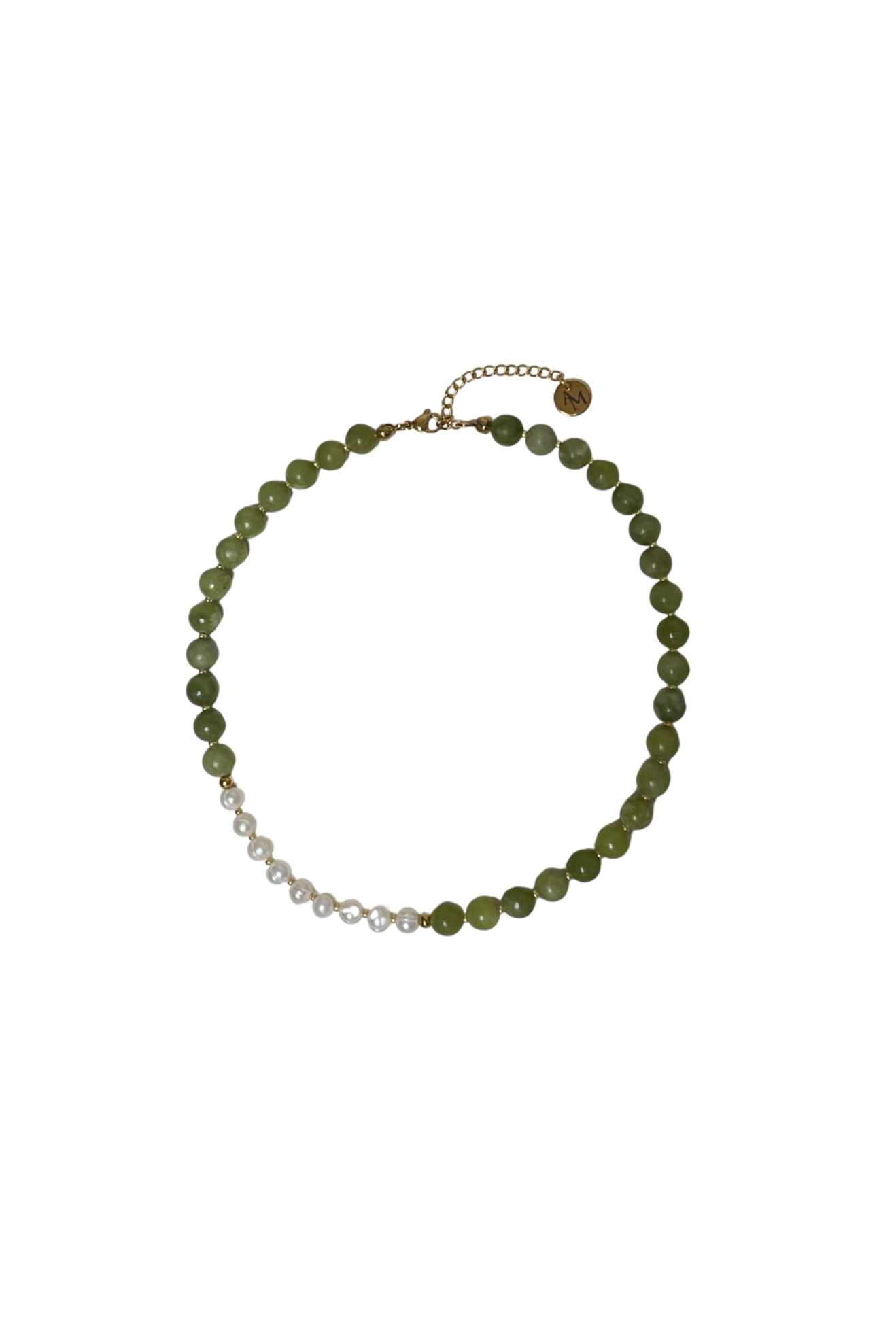Deze geweldige eyecatcher is gemaakt van serpentijn natuursteen kralen en zoet water parels. De kralen zijn zorgvuldig uitgezocht en de ketting is handgemaakt! Deze serpentijn kralen geven een reinigende en ontgiftende werking! Super leuk te combineren met een langere ketting!